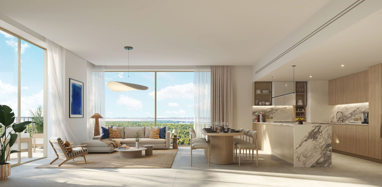 The development consists of 11 mid-rise towers with studios, 1–3 bedroom apartments, and select layouts with maid’s rooms. All residences feature open-plan interiors, large windows, premium Italian kitchen appliances, and elegant finishes. Select units offer generous terraces with panoramic views of the sea or lush internal courtyards.